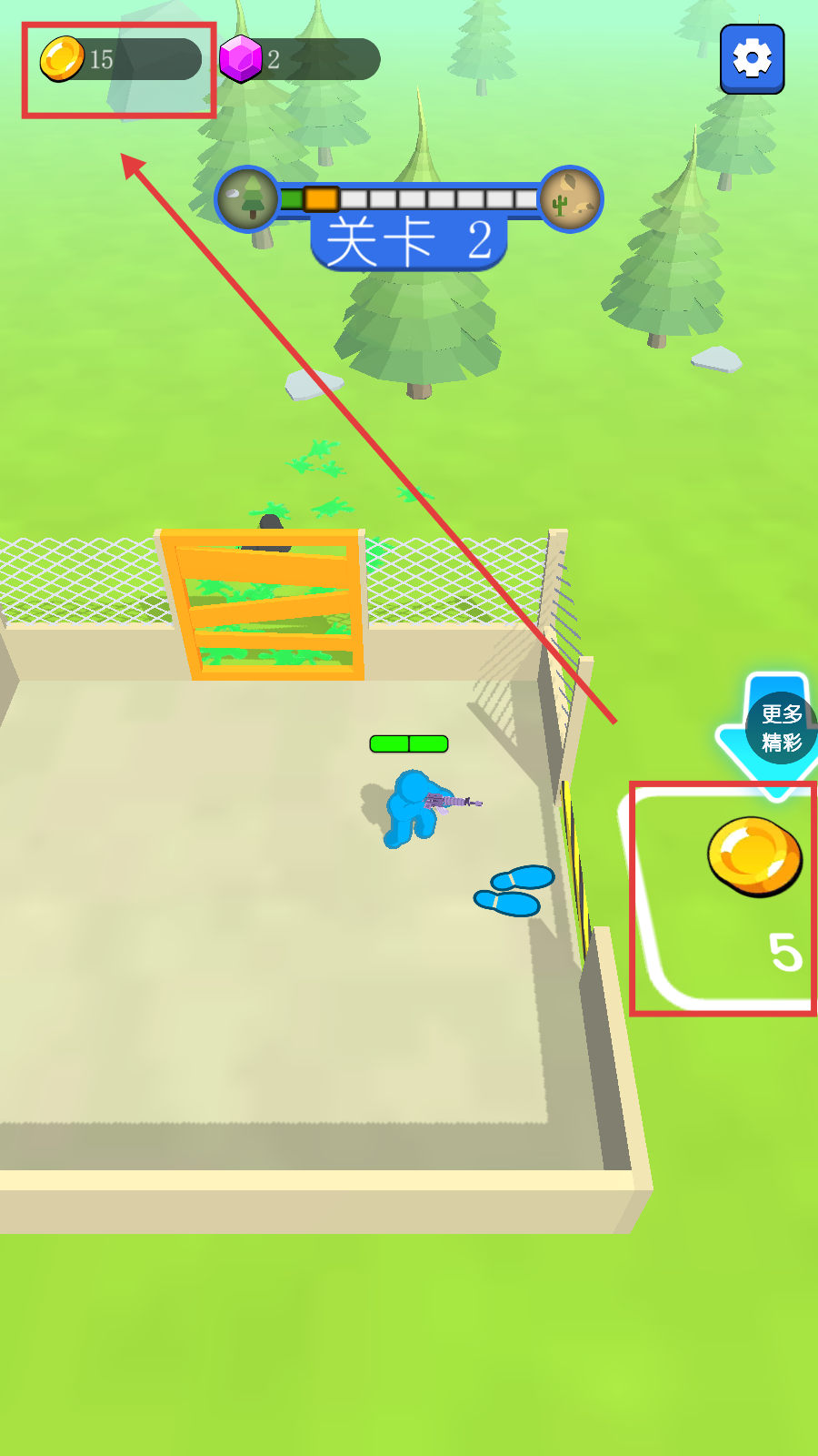 3、到了【关卡2】,移动角色靠近白色框内区域,即可花费5个货币扩建避难所。
