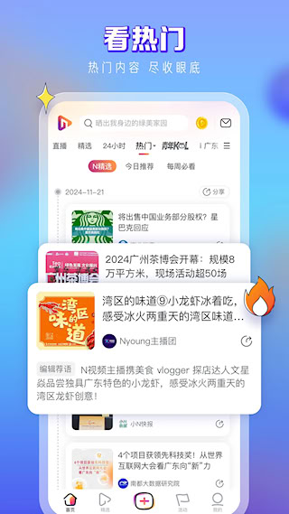 N视频APP是由南方报业传媒集团打造、南方都市报运营的新锐媒体平台。设有精选频道,聚合本地民生热点、湾区动态、国内国际要闻,以快节奏、强视觉的视频剪辑传递核心信息。主播说频道集结南方名编名记、原创主播、入驻号达人、青年KOL,在名编名记会客厅等栏目中输出深度观点、趣味解读。N视评频道则聚焦社会热点事件,用年轻化语言、网感表达进行犀利评论,形成具有青年共鸣的观点场。