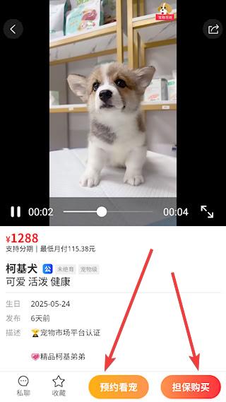 3、找到心仪的宠物,点击进入,可以在线预约看宠、购买等