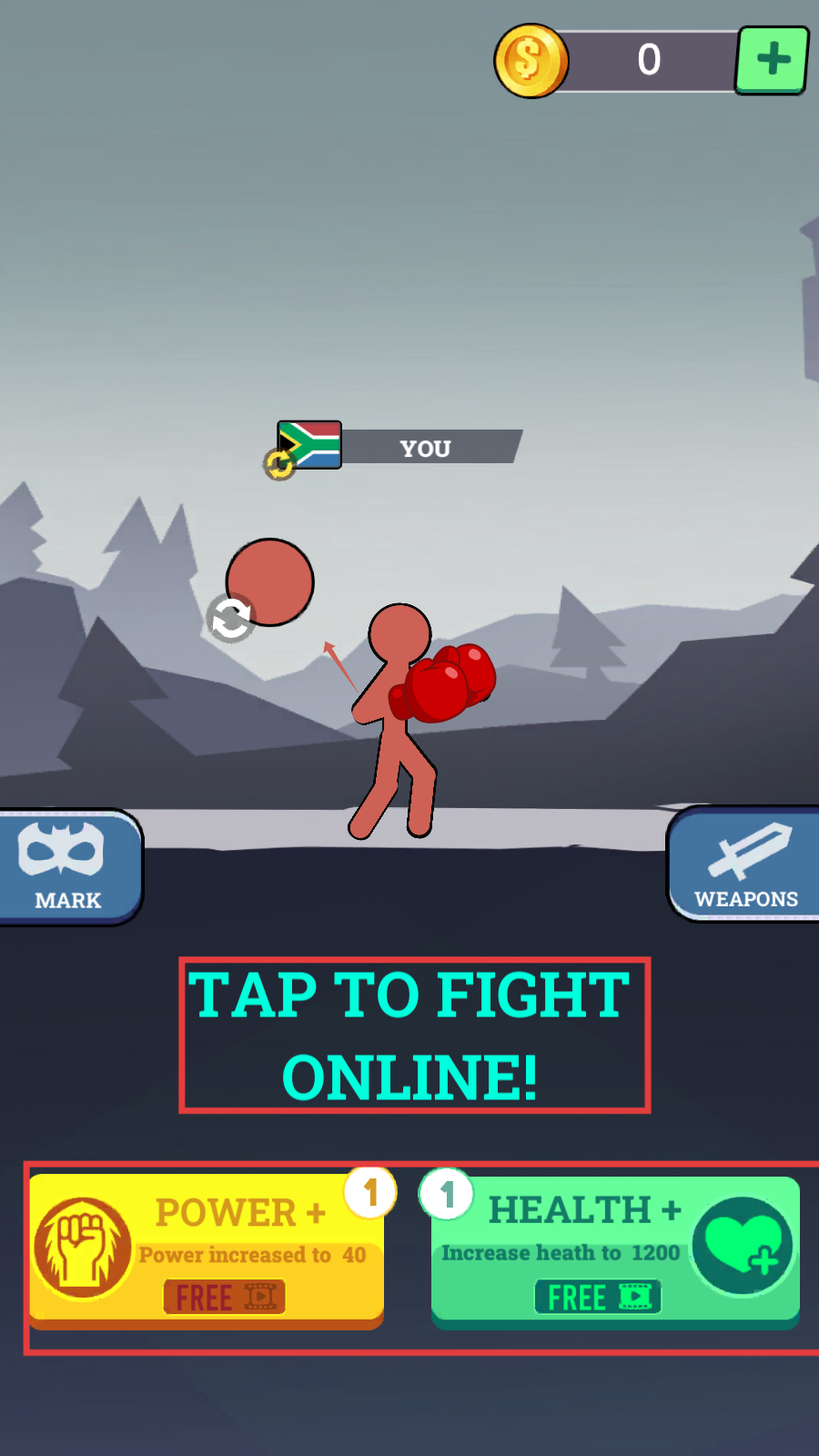 1、点击底部【POWER】或【HEALTH】可以升级火柴人属性,完成后点击屏幕开启在线对战。