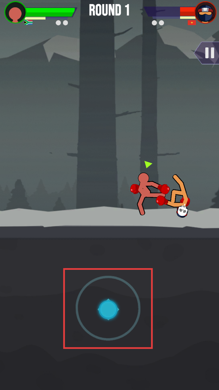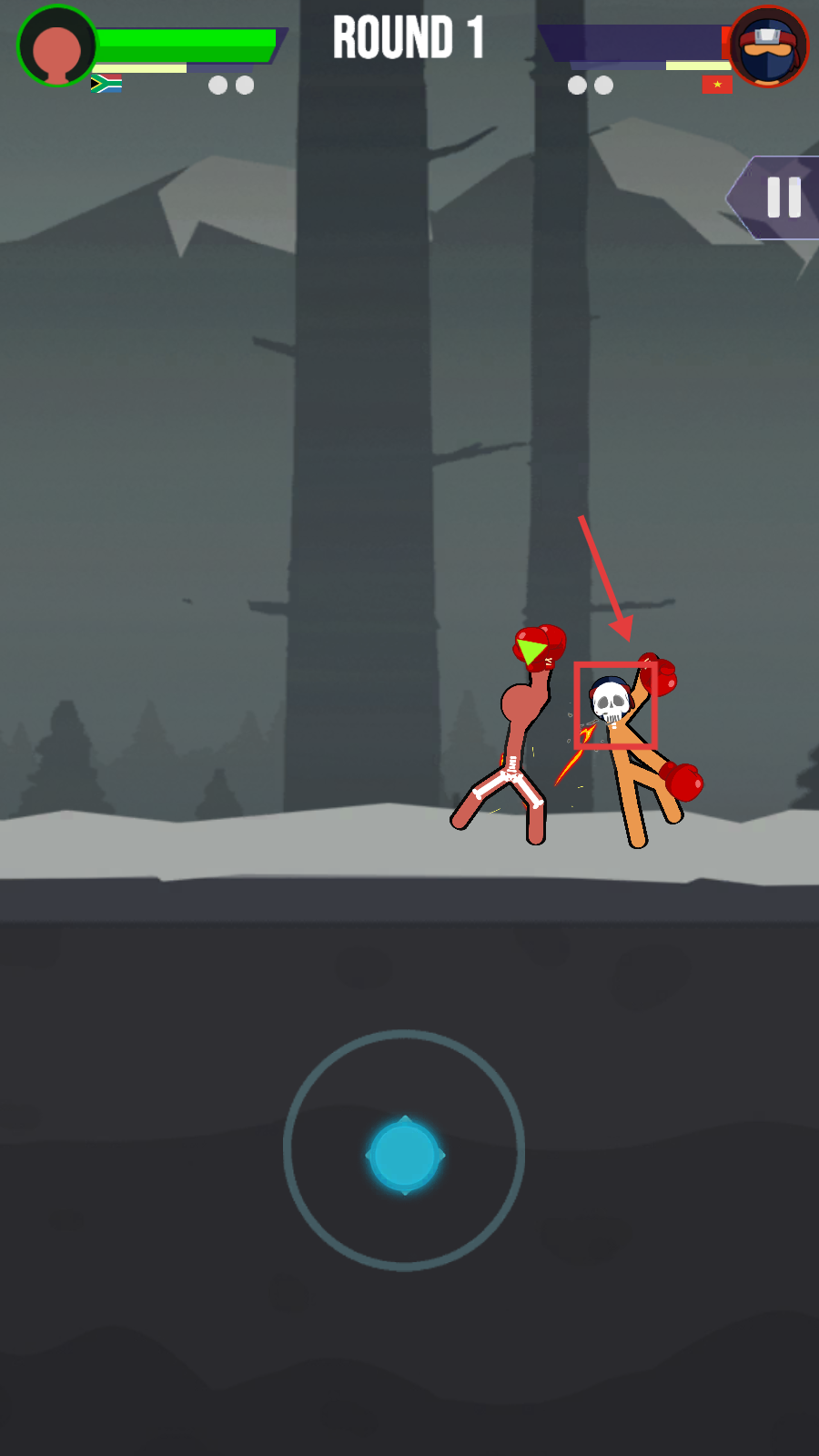 2、战斗时滑动底部蓝色按钮,控制火柴人移动和出拳,与对手展开近身搏斗。
