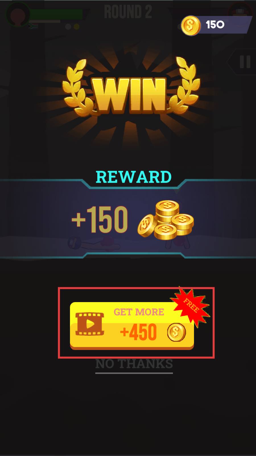 4、胜利后点击【GETMORE】观看广告,可以额外获取金币奖励,用于解锁新英雄或武器,在格斗场上一展雄风吧。