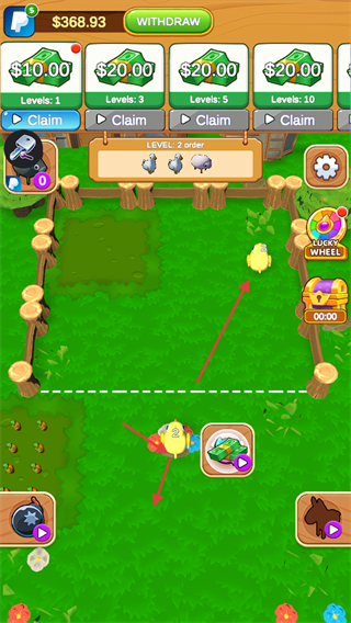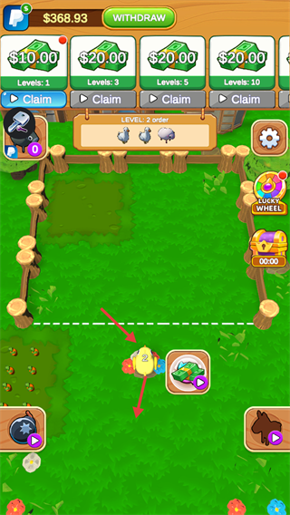 3、如图,再次将动物向后拉动,与颜色相同的动物合并在一起升级,直至任务完成。