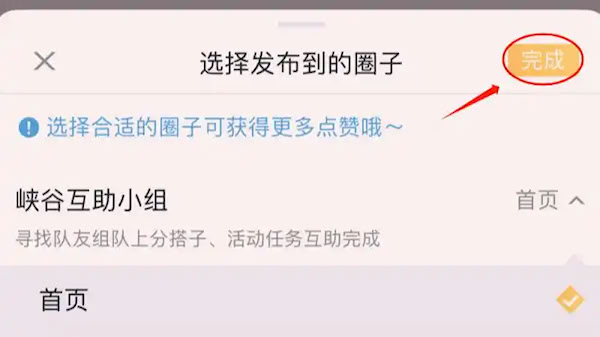 4、挑选发帖的圈子板块,点击右上角 “完成” 按钮。