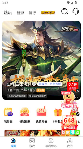 手游福利宝APP汇集了超多游戏福利。内置BT游戏大全,覆盖全品类手游,搭配自助0.1折充值的官方授权保障,所有游戏均为官方授权版本,充值折扣直连游戏厂商结算系统,确保每一笔0.1折都有迹可循,不用担心折扣虚标、账号风险。新玩家还能领取新人大礼:免费首充、内测特权、648元红包、大额代金券等。