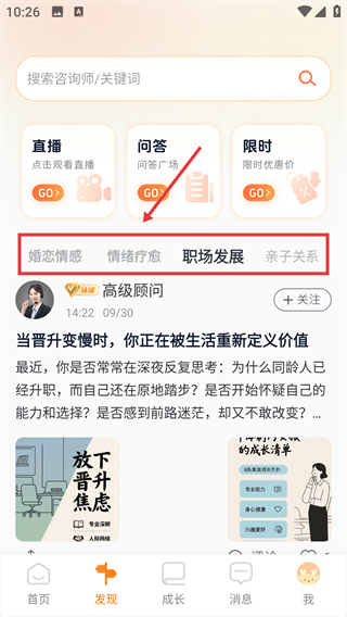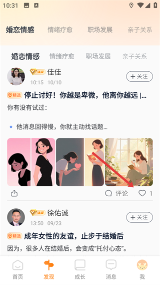 2、在发现页面,选择“婚恋情感”分类标签,切换到对应内容列表。