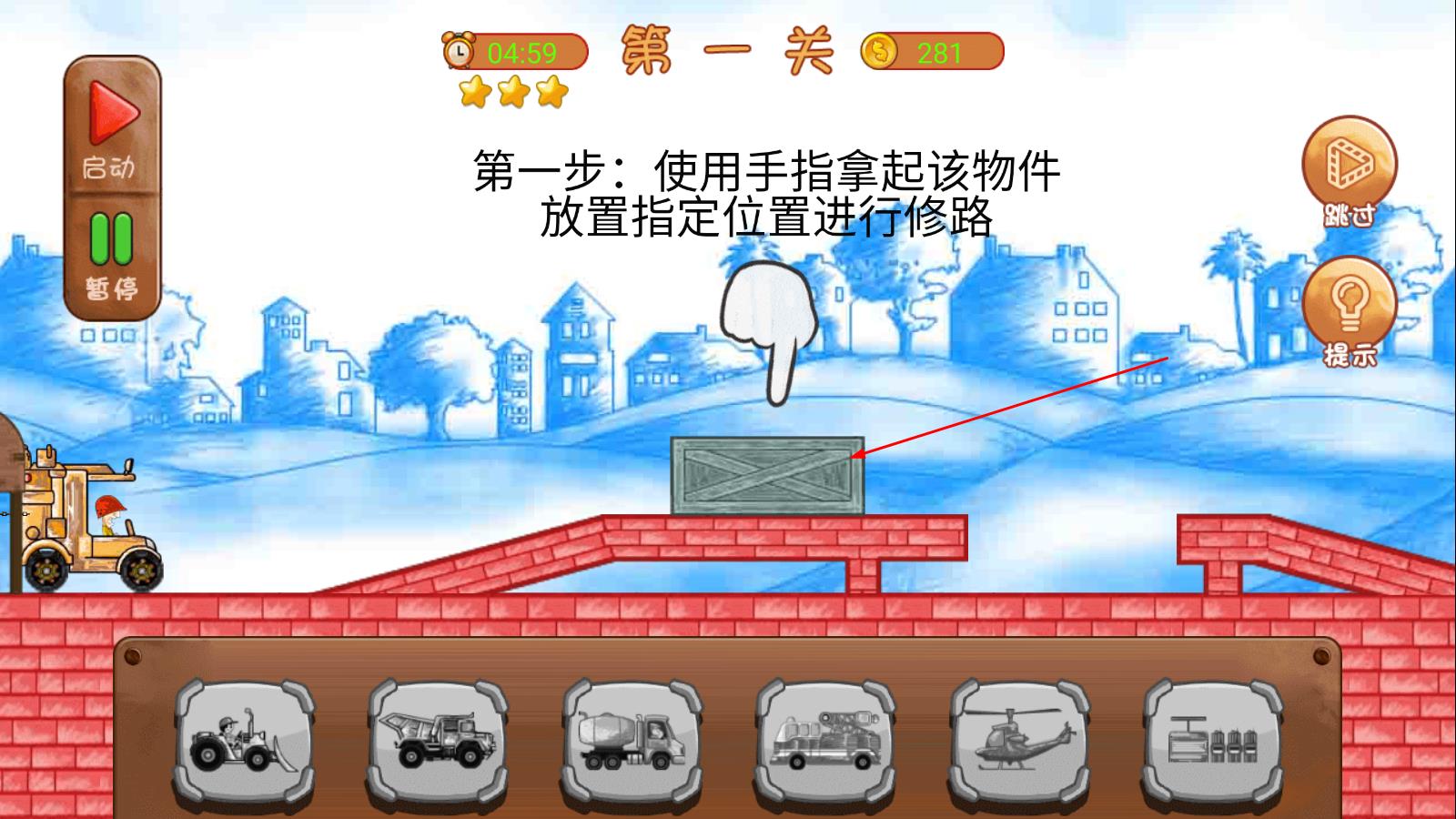 3、测试通行效果:修复完成后驾驶小汽车尝试通过,若车辆顺利驶过且道路稳固,则通关;若出现坍塌或卡顿,需重新调整修复方案。