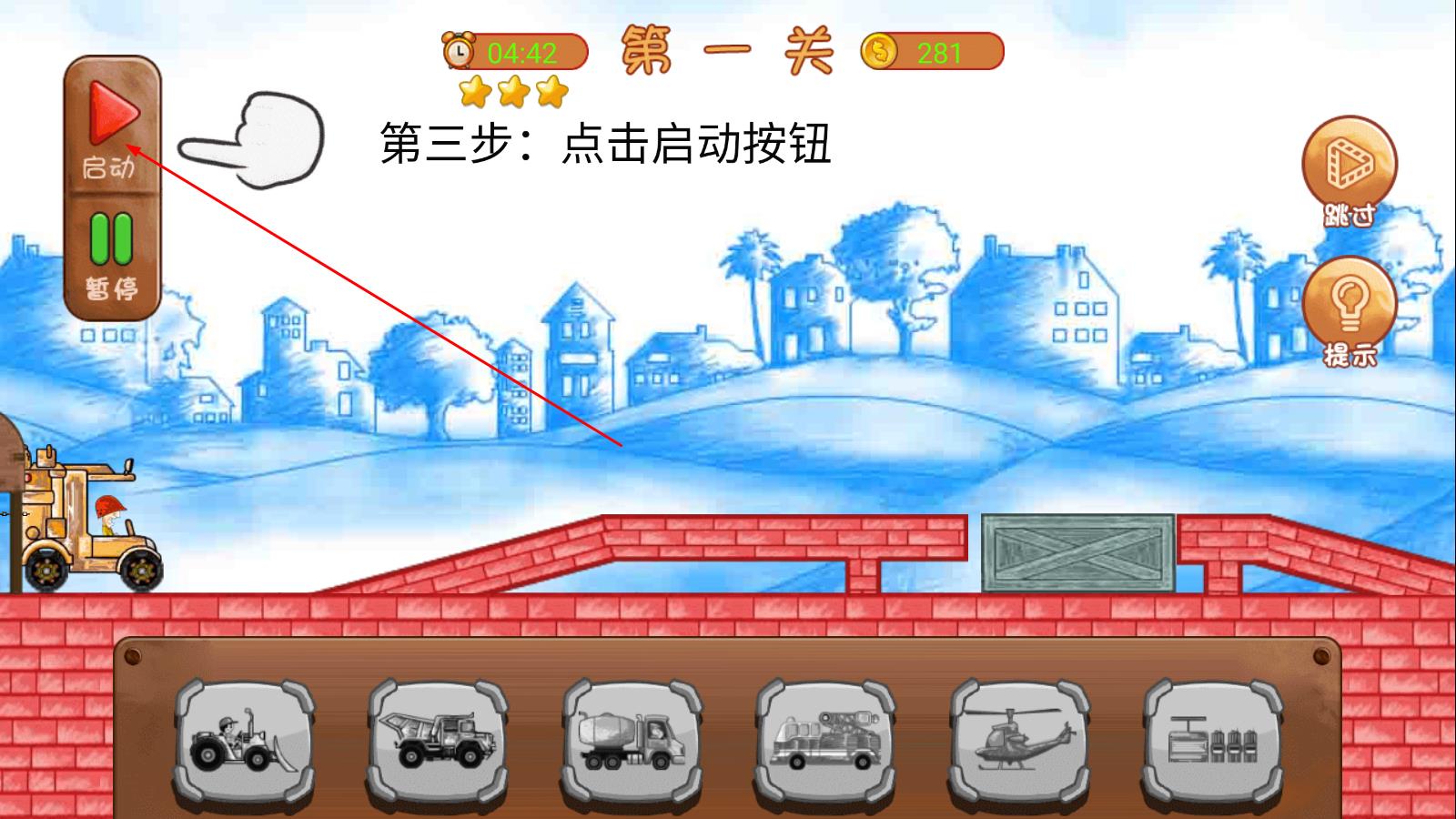 4、点击左侧红色【启动】按钮,让小车行驶通过修好的道路,完成关卡。