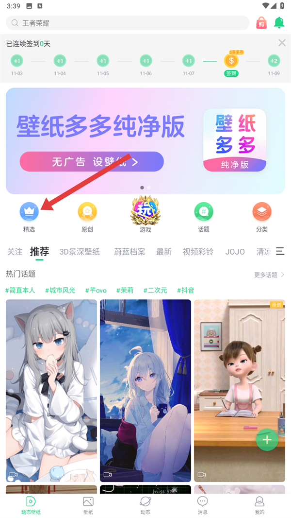 1、打开壁纸多多,点击【精选】入口,进入壁纸精选区域,踏入锁屏设置之旅呀。