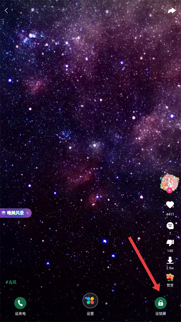 4、在壁纸详情页,点击右下角【设锁屏】按钮,就能把这张星空壁纸设置成我们的锁屏了呢。