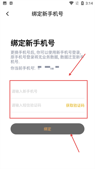 4、依次填写新手机号、获取并输入对应验证码,点击“绑定”按钮完成手机号更换。