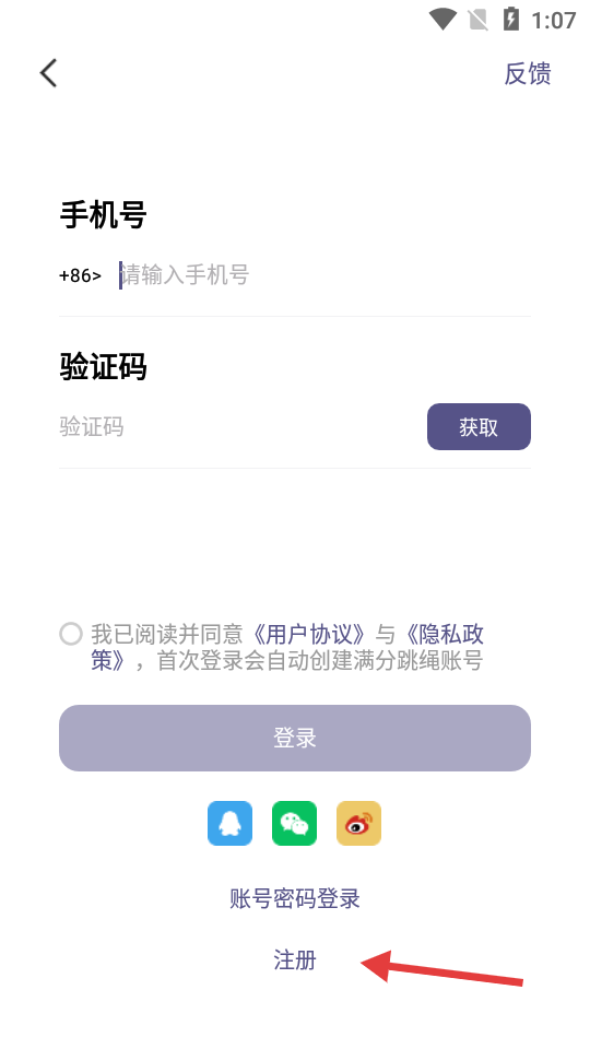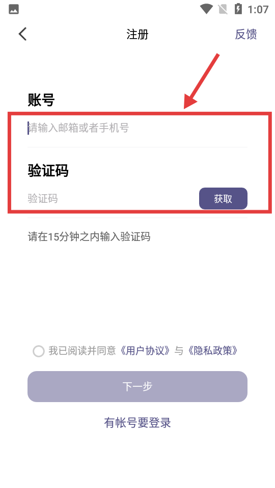 2、在注册界面输入邮箱或手机号,点击【获取】验证码。
