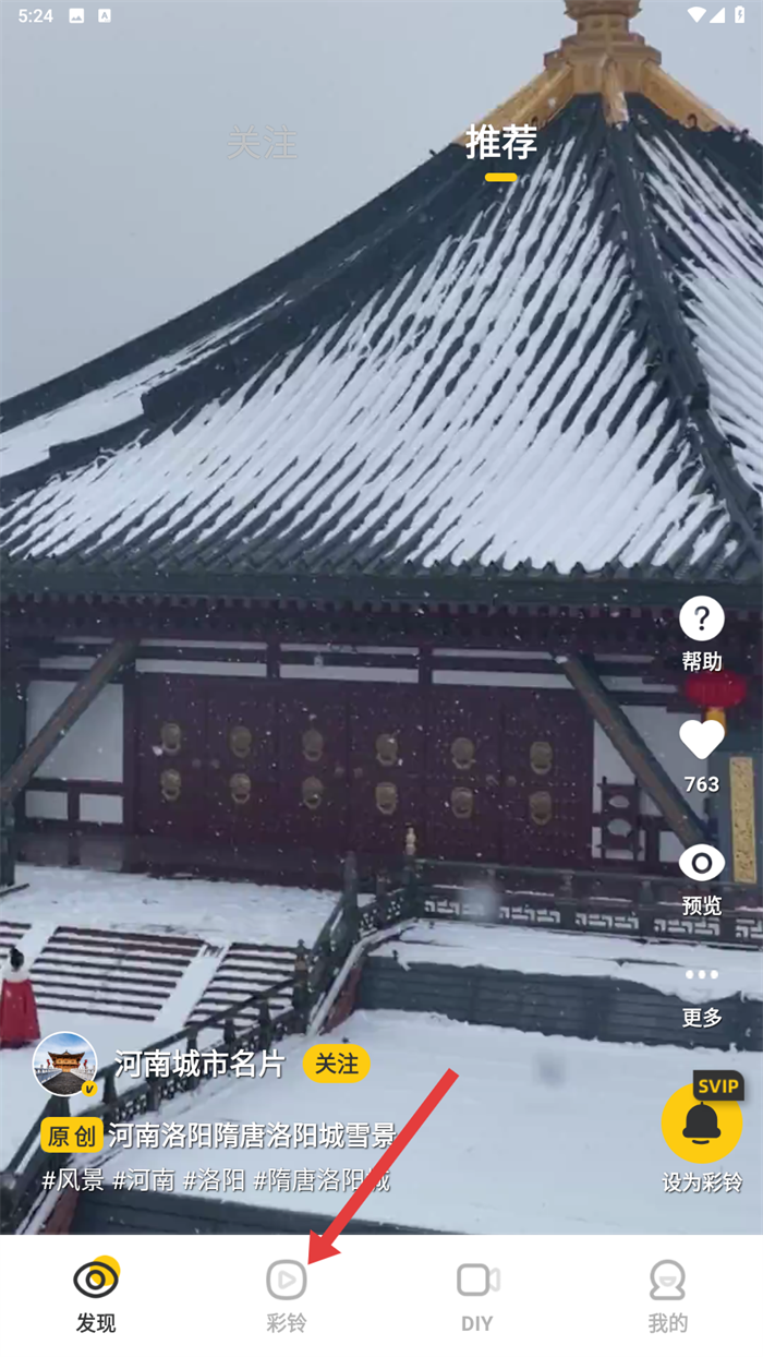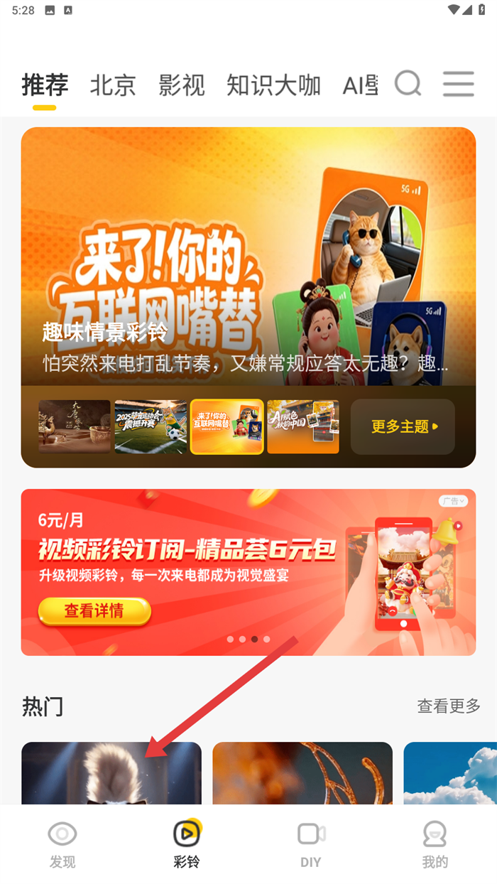 1、在发现界面可以像刷短视频一样寻找彩铃,点击右下角的按钮设置彩铃
