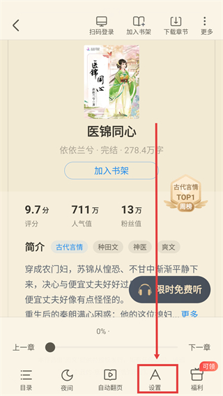 2、进入书籍详情页后,点击底部的【设置】按钮,可打开阅读设置界面,调整阅读相关参数。