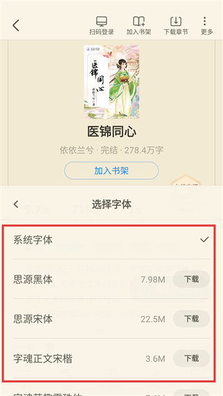 4、进入字体选择页面后,可选择【系统字体】或下载其他字体,按需切换书籍的阅读字体。
