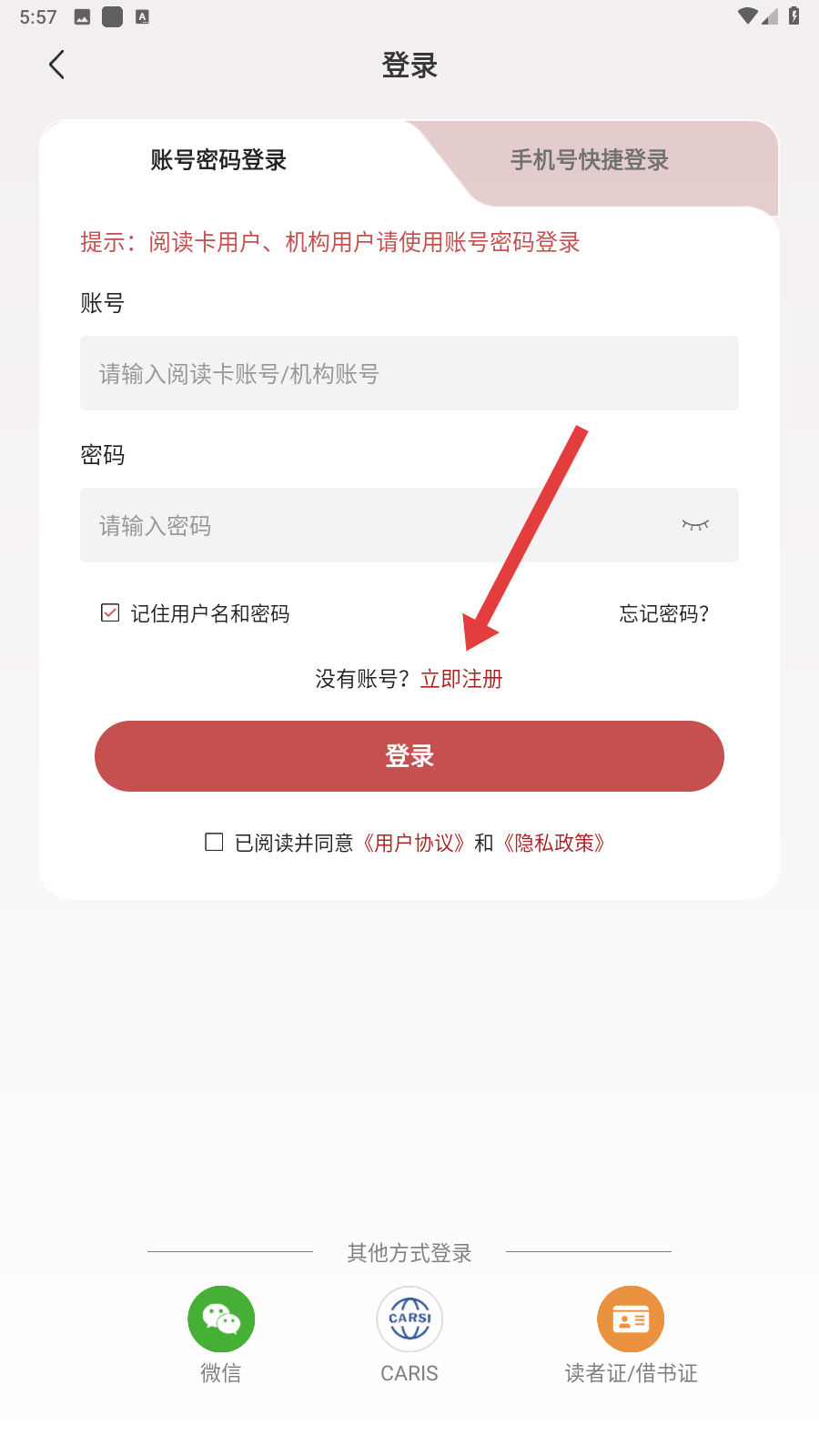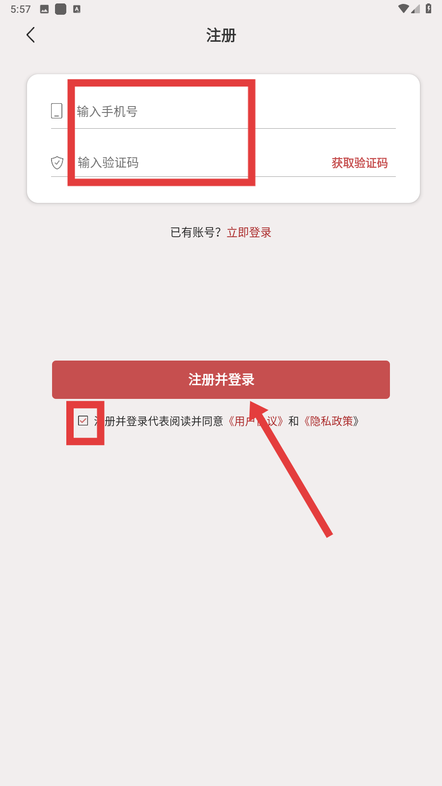 4、若未注册,点击【立即注册】,输入手机号和验证码完成注册并登录。