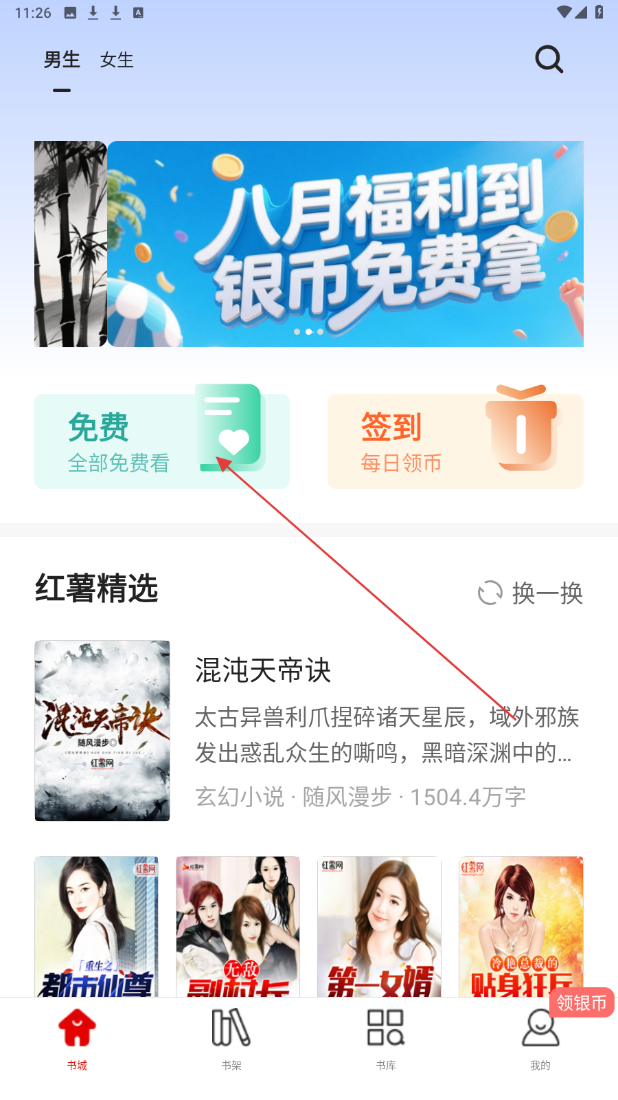 1、打开红薯网,点【免费】可进入免费书库,浏览海量免费小说。