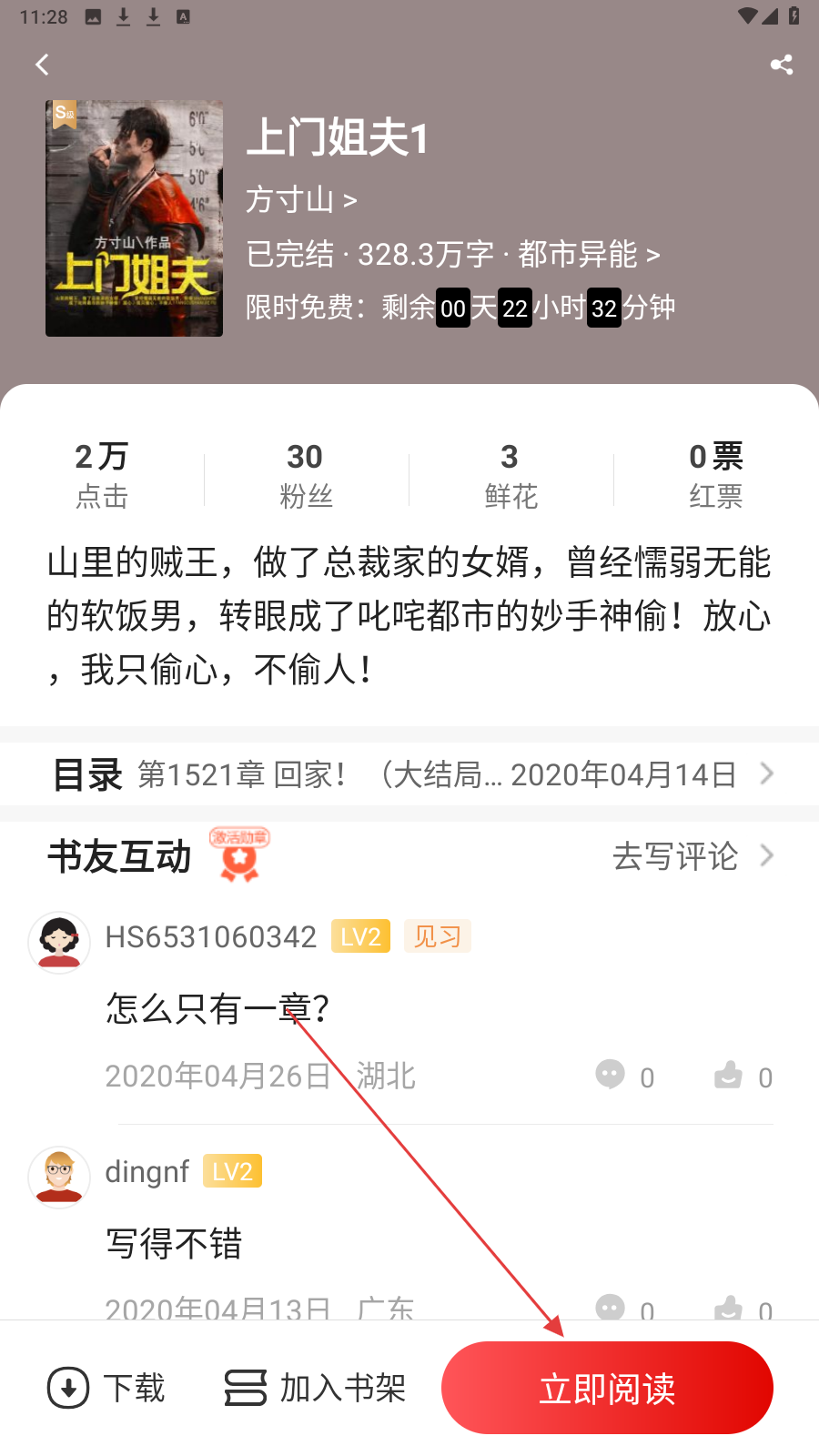 3、小说详情页有【立即阅读】按钮,点击可开始阅读小说内容。