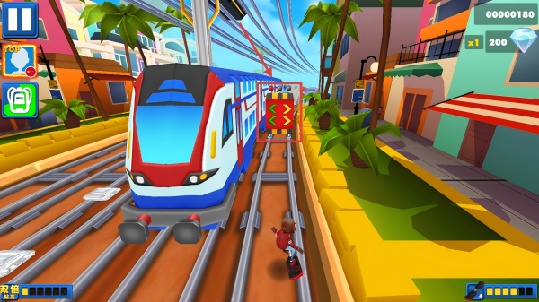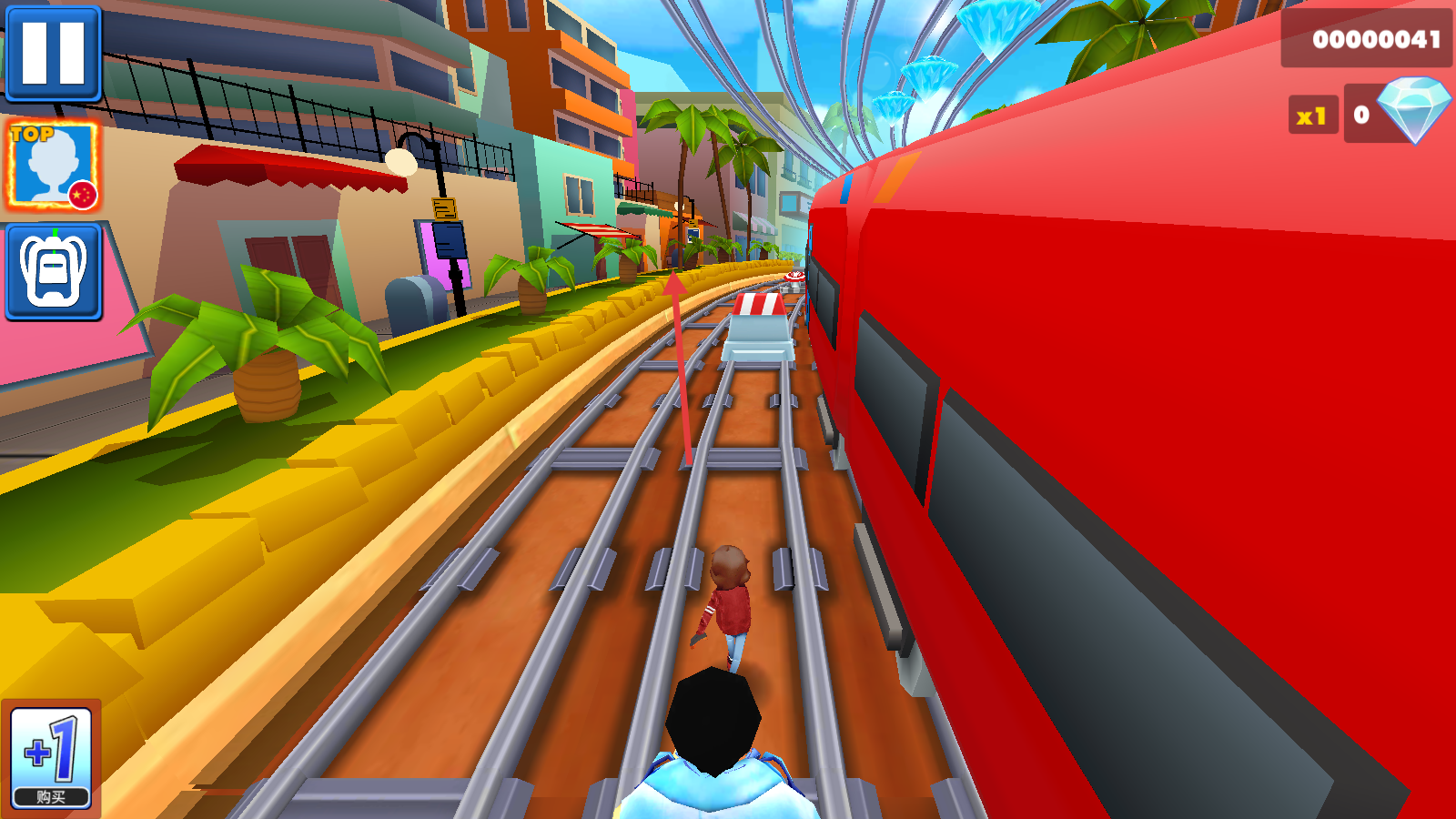 2、遇到火车挡路,观察前方带箭头的障碍物,及时左右滑动,切换轨道,躲开火车。