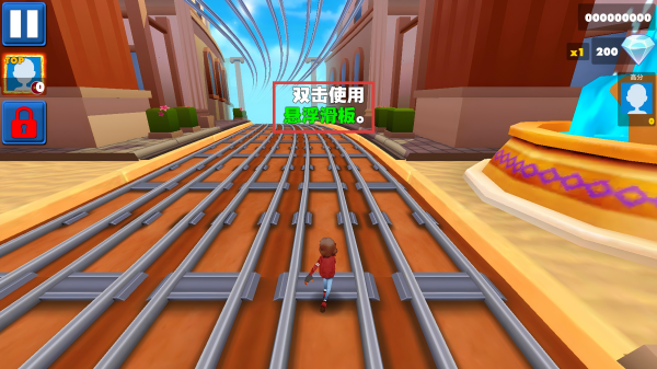1、开始跑酷时,看到【双击使用悬浮滑板】提示,我们双击屏幕,触发悬浮滑板,助力快速前进。
