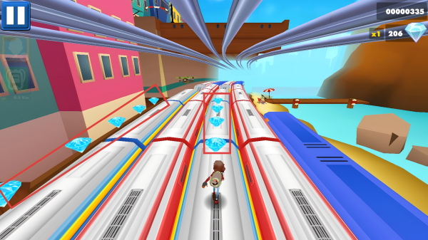 3、跑酷途中,发现轨道上的钻石,我们控制角色移动,尽可能多收集,用于购买道具。