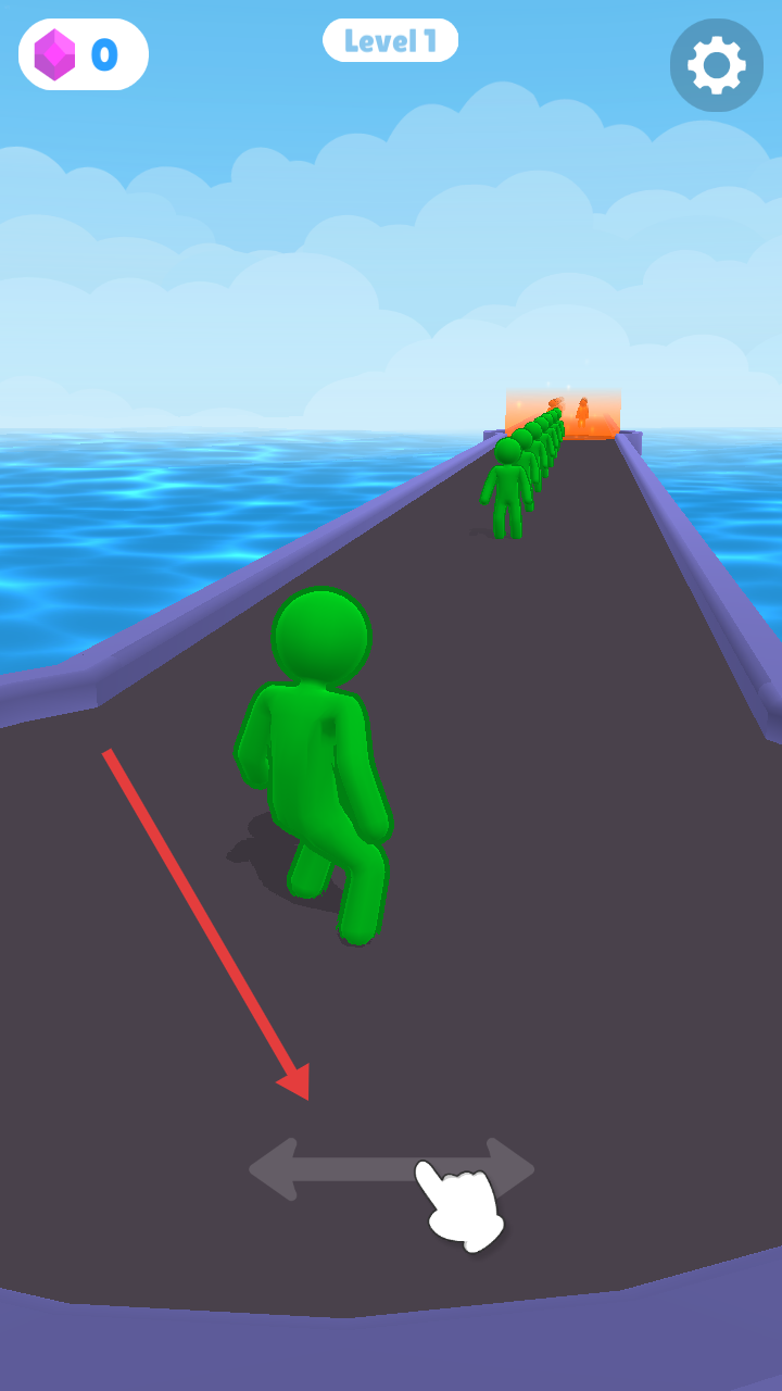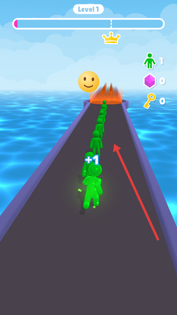 1、滑动屏幕操控绿色角色在海上赛道前进,收集绿色小人壮大队伍,向终点的橙色区域前进。