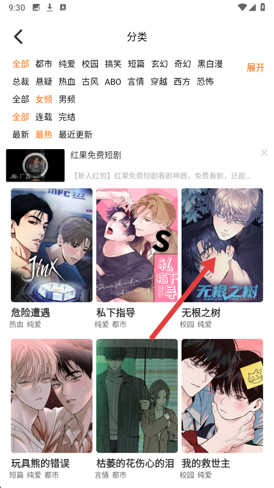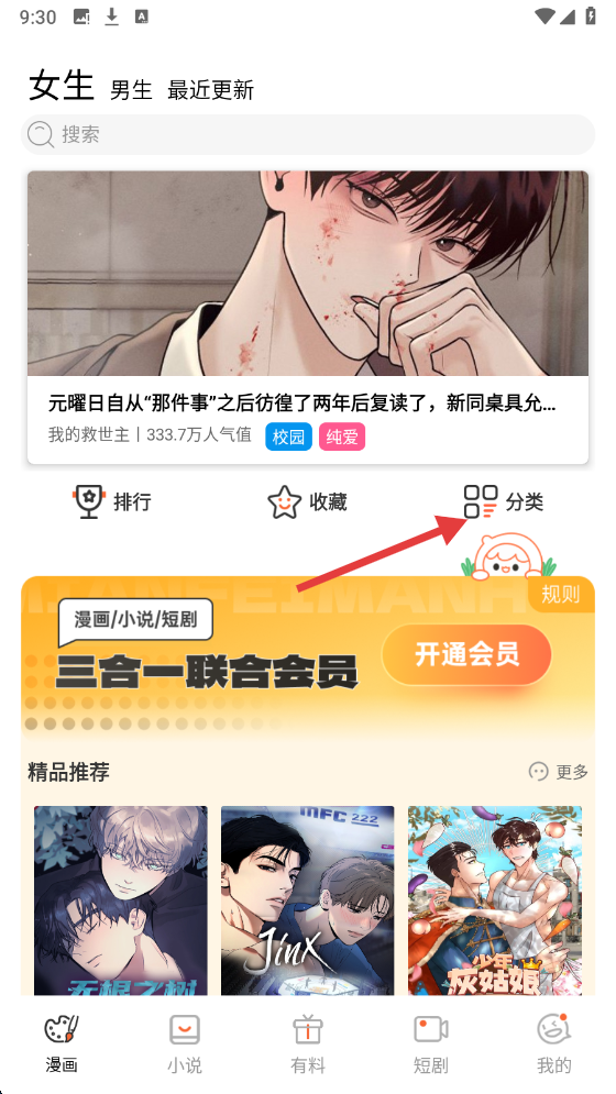 1、首页点击【分类】,进入漫画分类筛选页面。