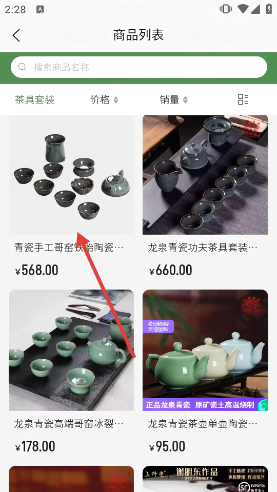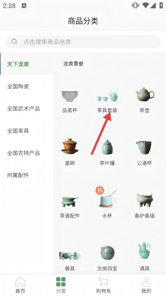 2、在【商品分类】页的【龙泉青瓷】栏,选择【茶具套装】,查看对应商品。