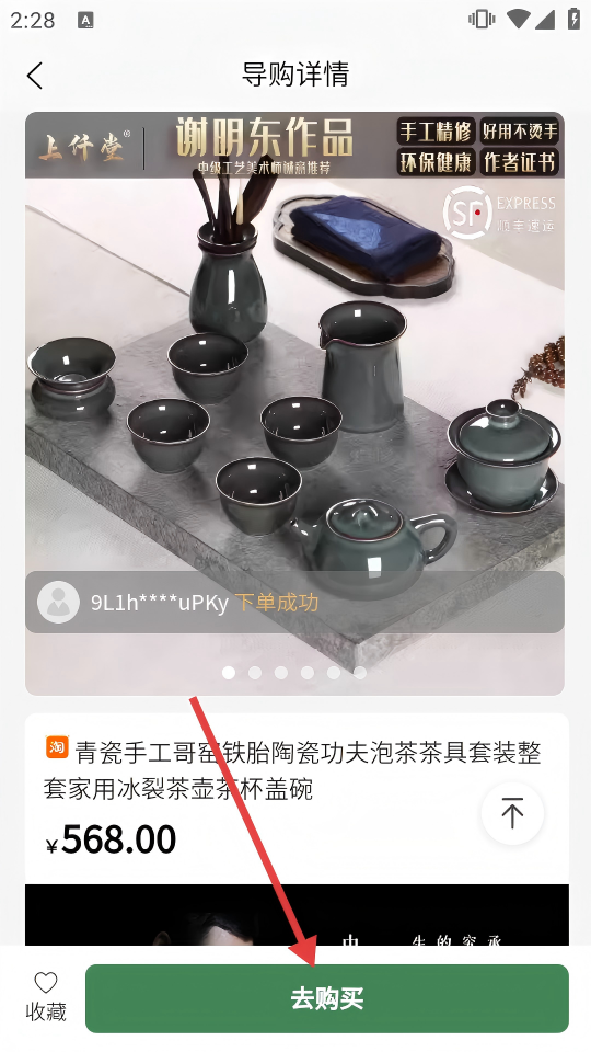 3、【商品列表】中点击心仪茶具,如【青瓷手工哥窑铁胎陶瓷】,进入导购详情。