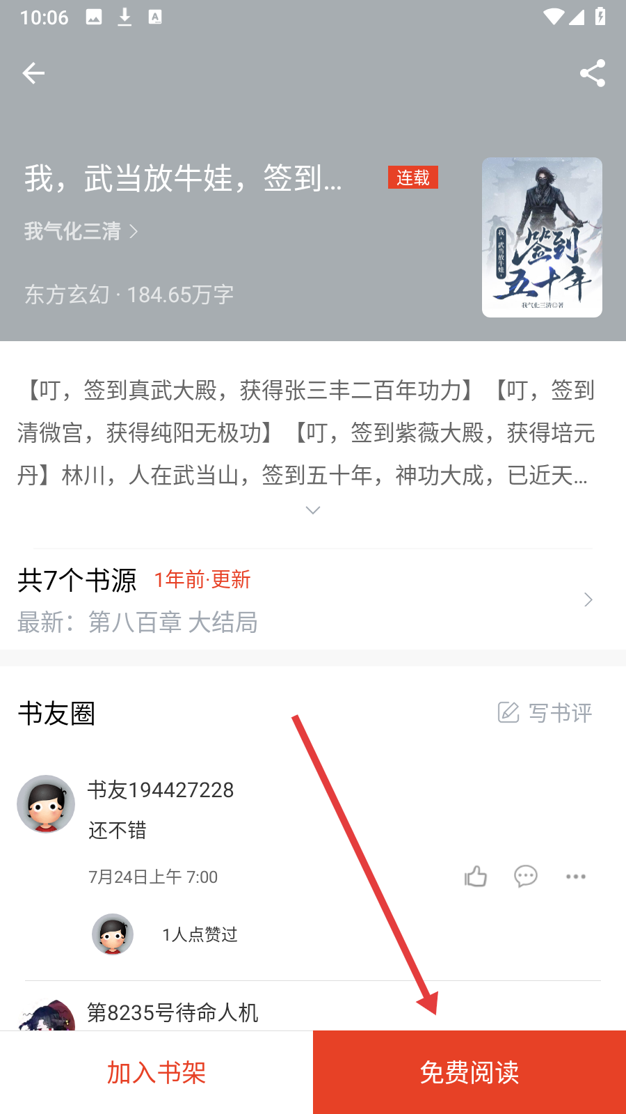 3、书籍页点【免费阅读】,进入阅读或选书源环节。