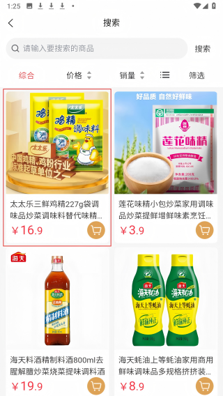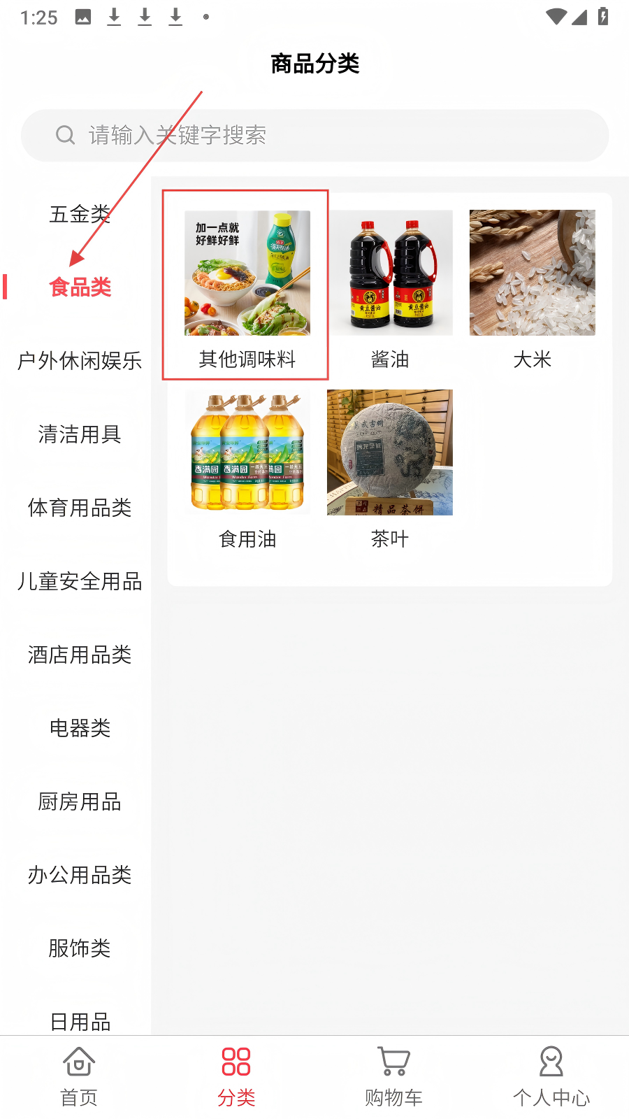 1、进入商品分类页,左侧导航点击【食品类】,选择右侧【其他调味料】图标,进入调味料商品列表。