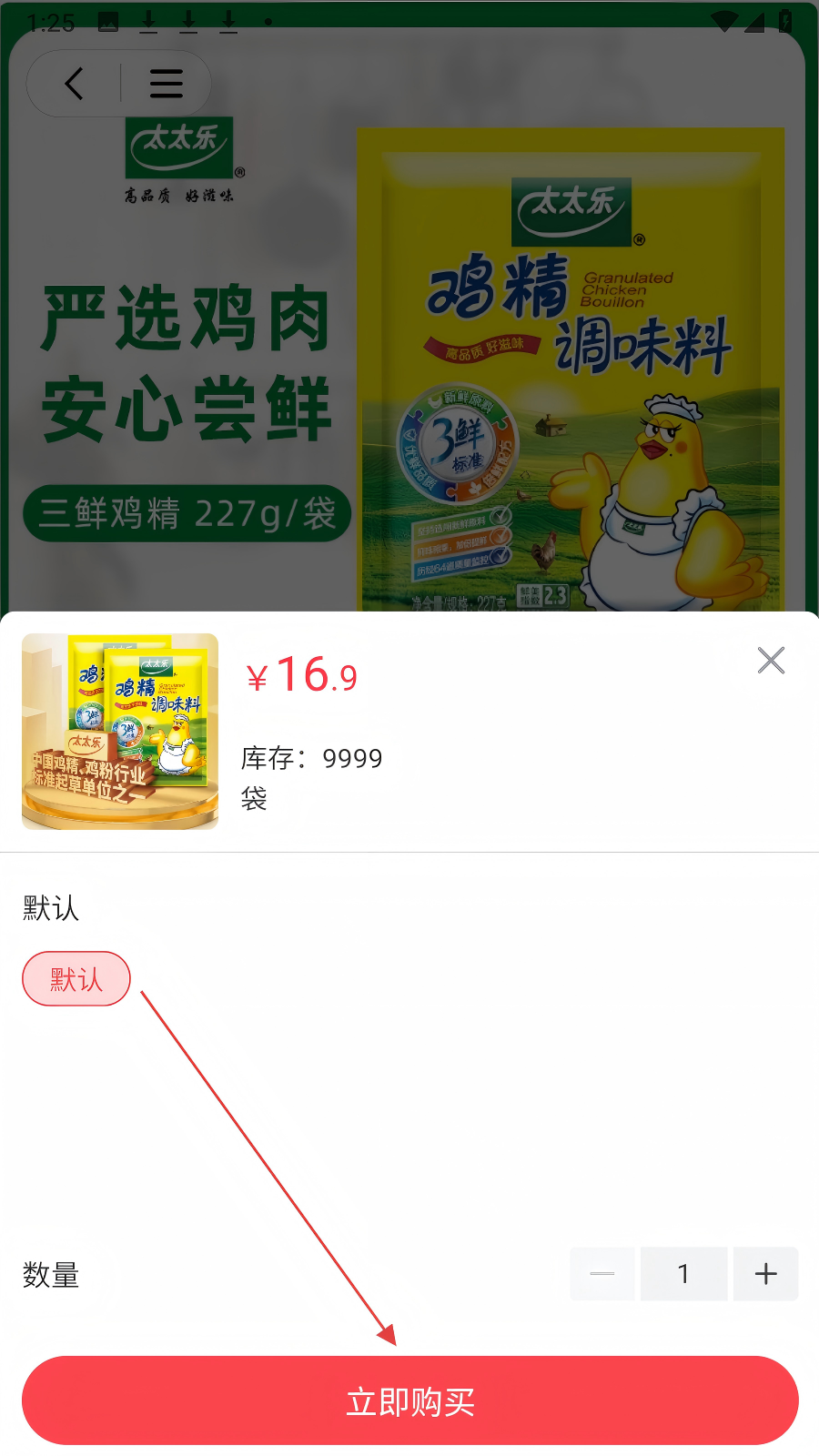 4、弹窗内确认规格及数量后,点击底部红色【立即购买】,完成下单流程。