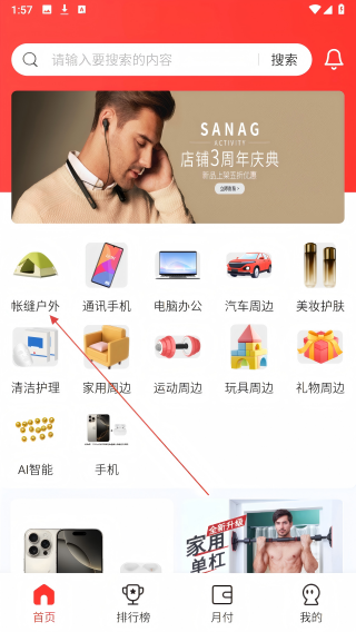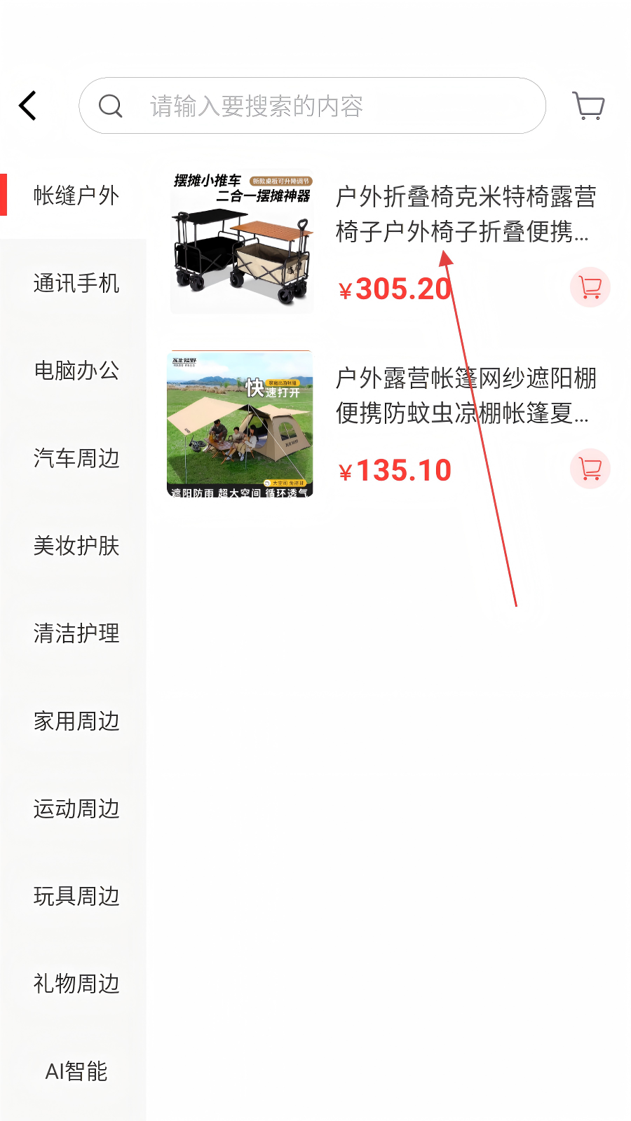 1、进入APP首页,点击【帐篷户外】分类进入商品列表。