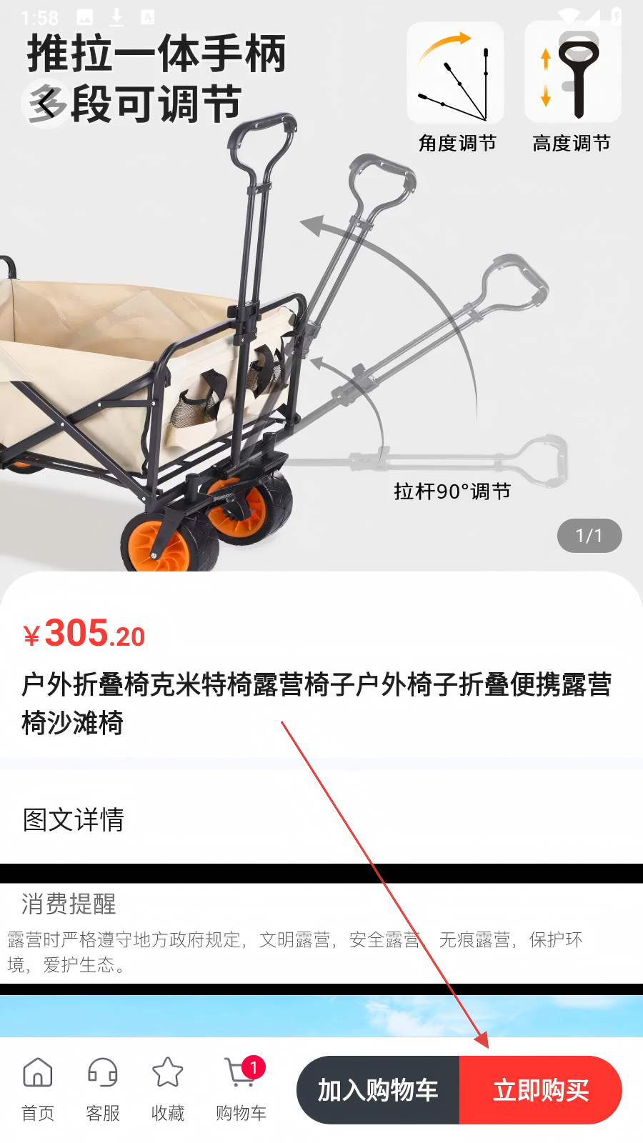 3、在商品详情页,点击【立即购买】进入确认订单页。
