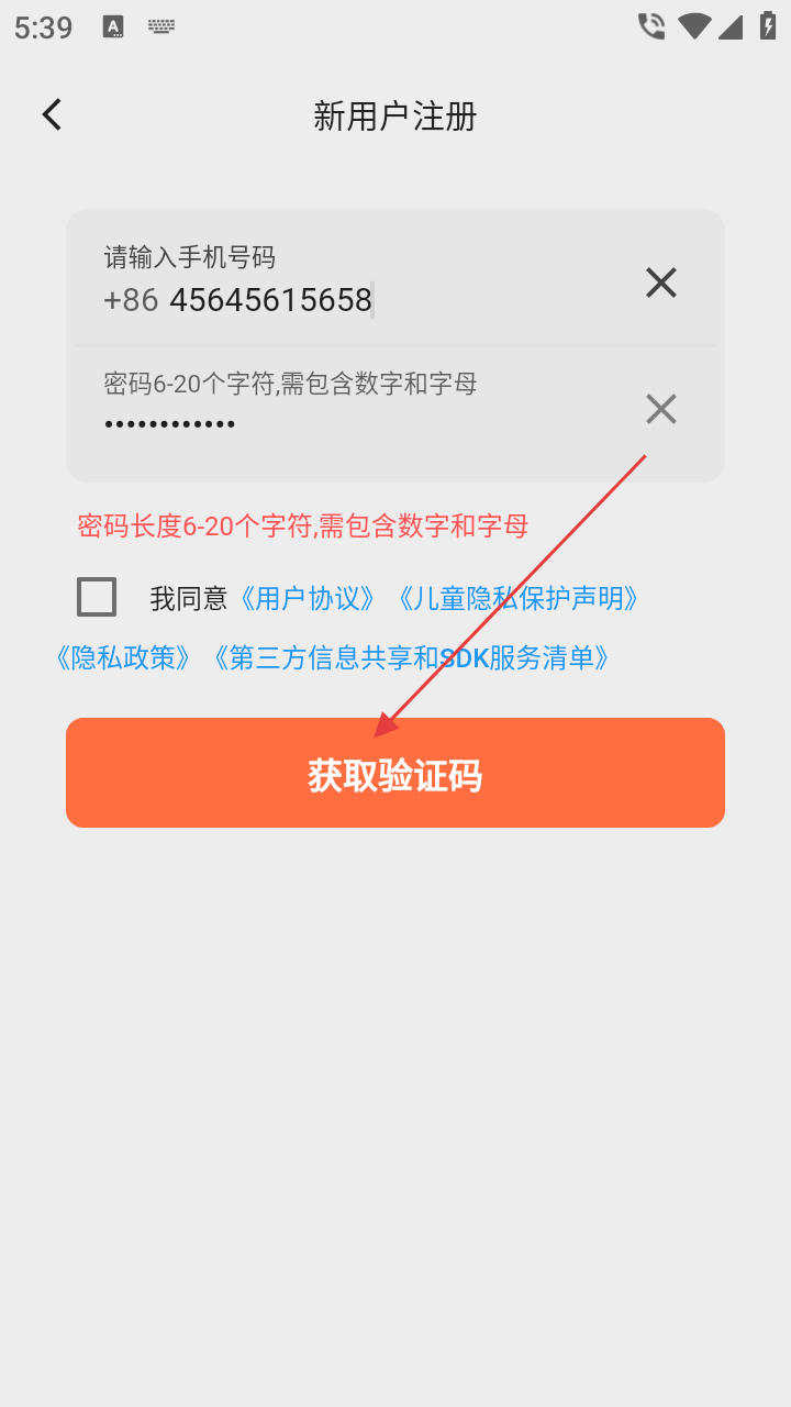 4、填好信息勾选协议后,点【获取验证码】继续注册。