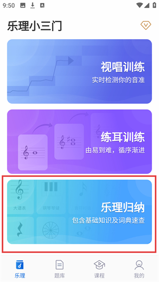 1、在【乐理小三门】页面找到【乐理归纳】入口,点击后可进入该模块。