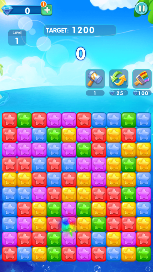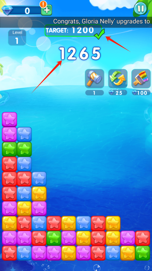 3、当分数超过1200时,就已达通关分数,但游戏并未结束,需把可消除的星星,全部消除后才能进入下一关卡。