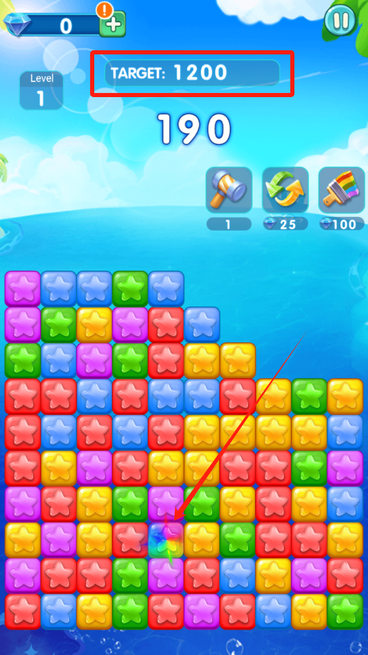 2、关卡1的目标分数是1200分,点击这个彩虹星星,可以把周边8个星星一起进行消除。