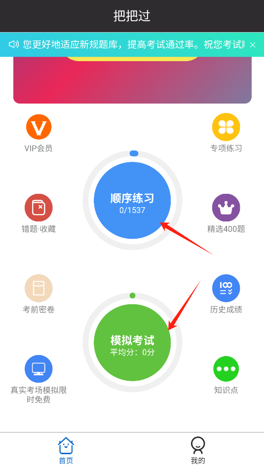1、打开APP,在首页中,先点击顺序练习进入,学习完成后,再点击进入模拟考试。