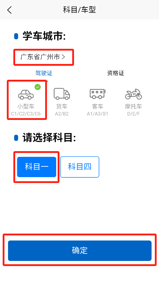 2、学习模式中,选择自己所在的城市,选择考试车型,选择科目,点击确定进入学习。