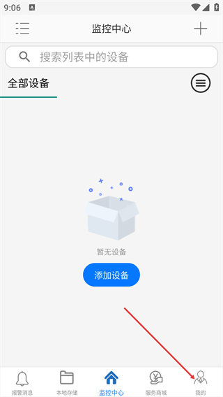 1、进入【监控中心】界面,点击中间【添加设备】按钮,开启设备添加流程。