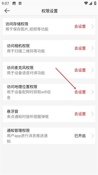 3、在【权限设置】页面,点击【访问地理位置权限】旁边的【去设置】按钮。
