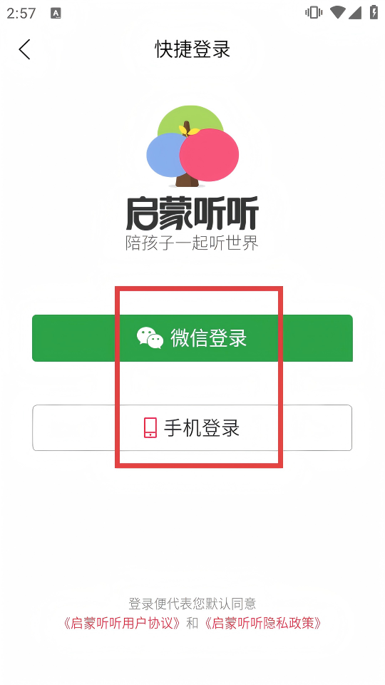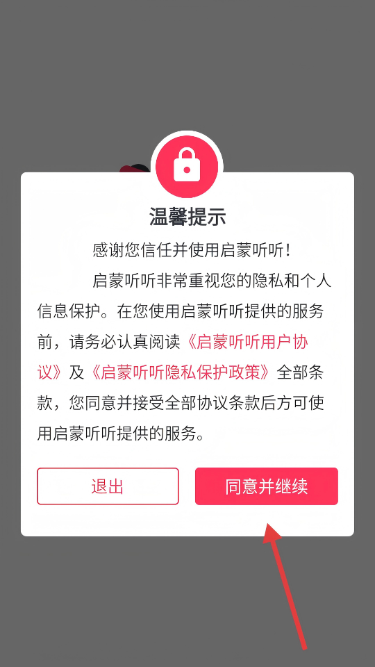 1、弹窗出现时,点击【同意并继续】,接受协议后进入启蒙听听应用主界面。