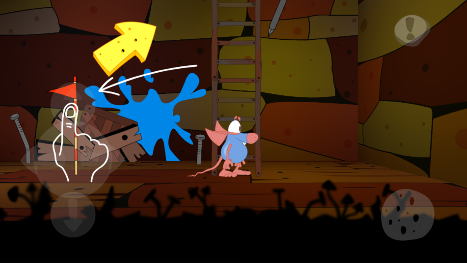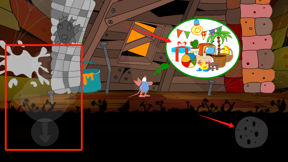 1、游戏中,滑动左边的按钮控制老鼠移动和跳跃,右下角的按钮可以把奶酪当做武器丢出去打蜘蛛。