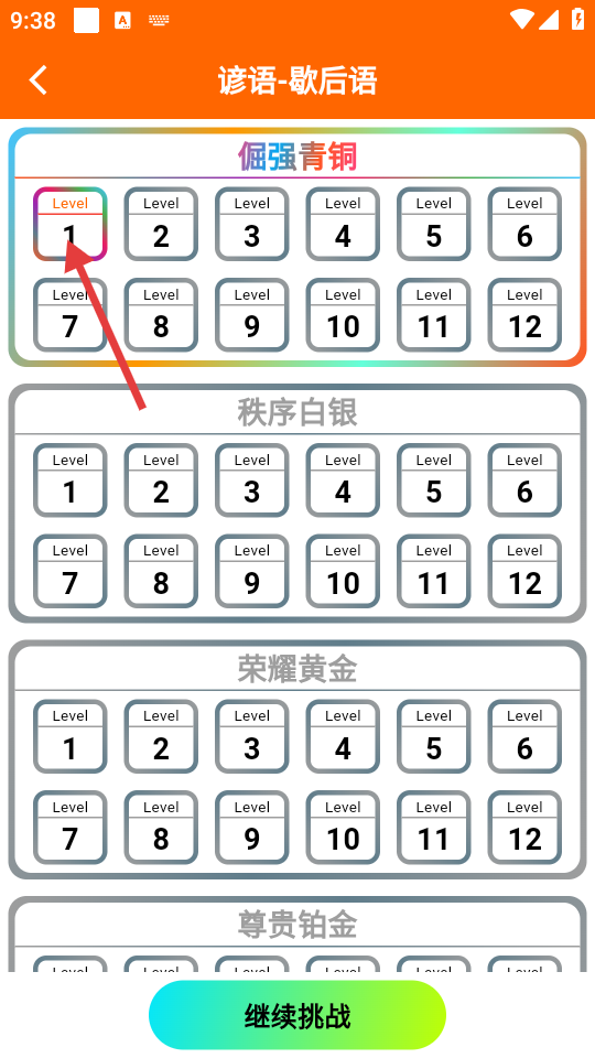 3、在【谚语-歇后语】界面,点击【倔强青铜-Level1】,开启初级挑战,逐步解锁更高等级内容。
