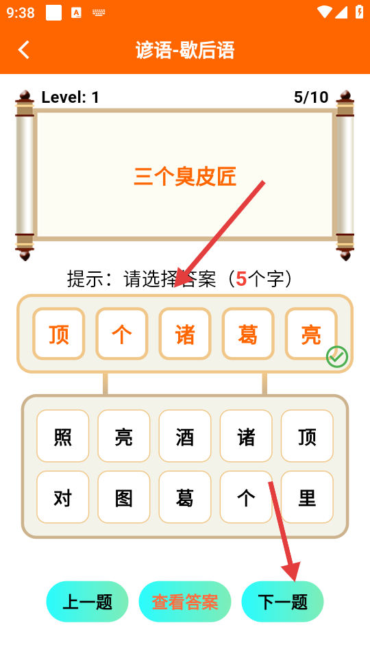 4、答题时根据提示选字,如“三个臭皮匠”对应【顶个诸葛亮】,完成后点【下一题】,持续推进挑战。