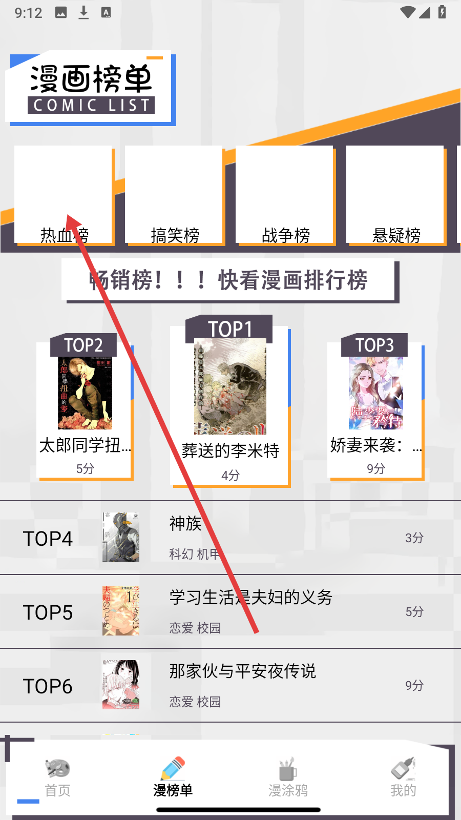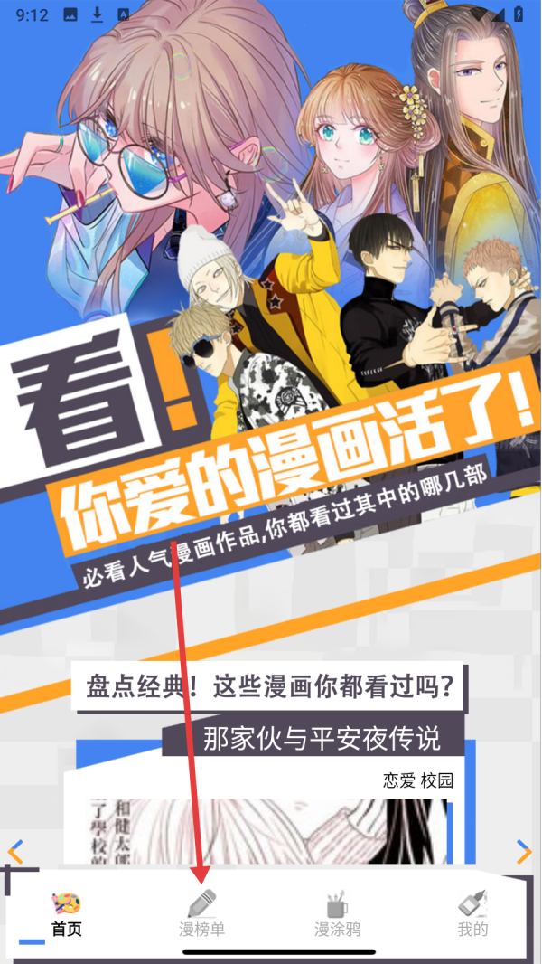 1、首页底部点击【漫榜单】,进入漫画榜单浏览页面。
