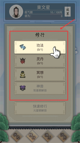 2、进入修行界面后,优先点击【功法】选项,开启基础修炼,为后续提升修为和战力打下核心基础。