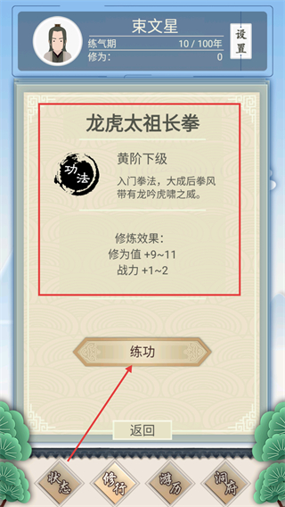 3、选择【龙虎太祖长拳】功法,点击【练功】按钮,可提升修为值9到11点和战力1到2点,稳步增强实力。