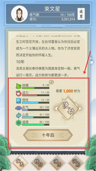 4、积累足够修为后,点击【渡劫】按钮突破境界,或通过【十年后】快速推进时间,提升各项属性数值。